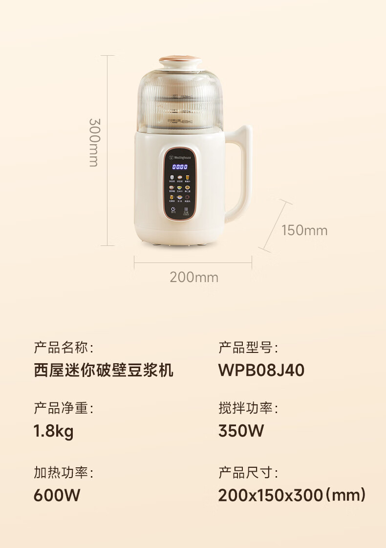 商品名称:西屋(Westinghouse)豆浆机小型迷你破壁机家用多功能料理机全自动免滤辅食机 WPB08J40