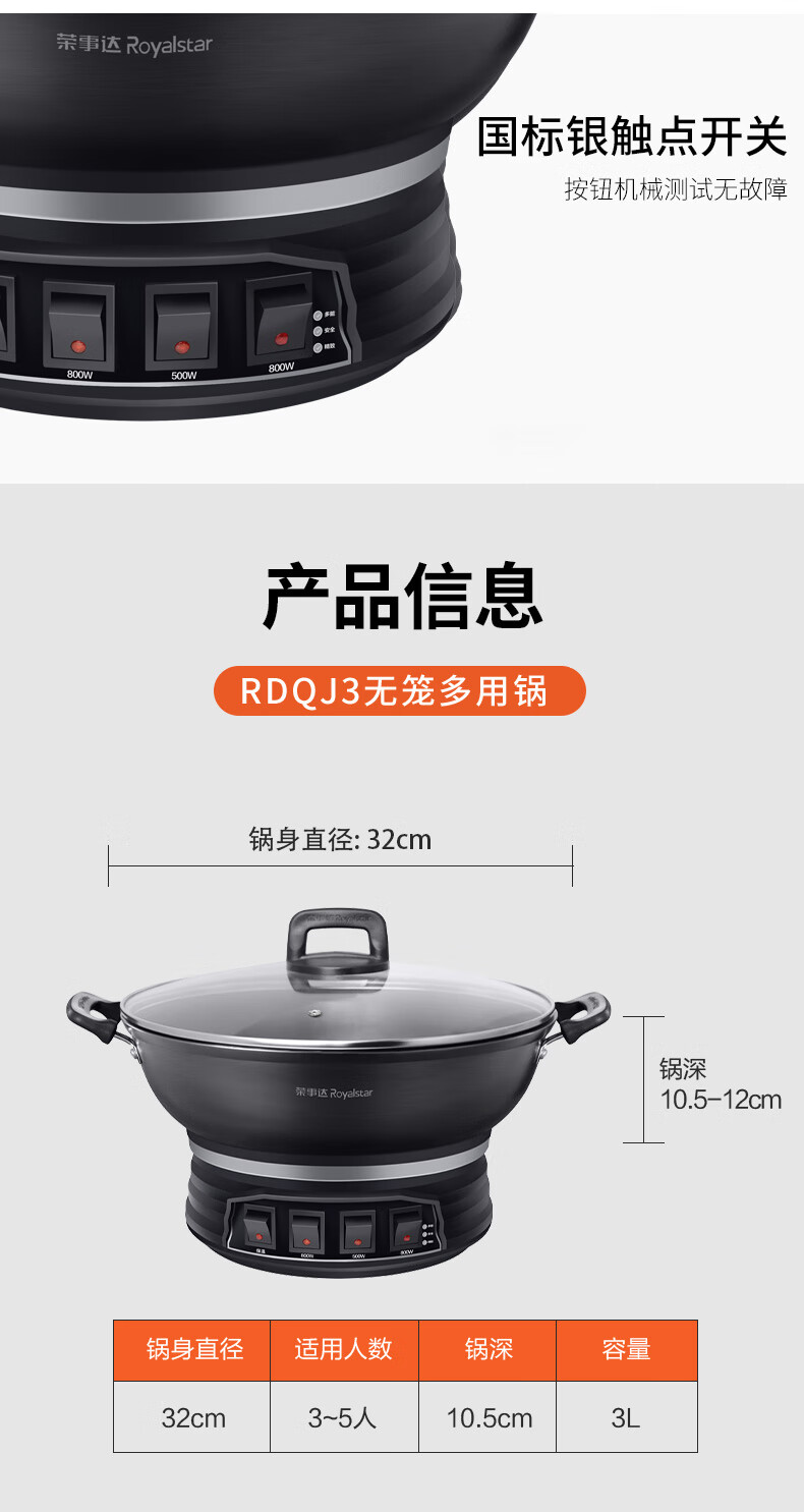 商品名称:荣事达(Royalstar)电炒锅电蒸锅多功能家用电炒菜炒锅一体式炒锅大功率蒸煮锅电热锅电火锅RDQJ3-32