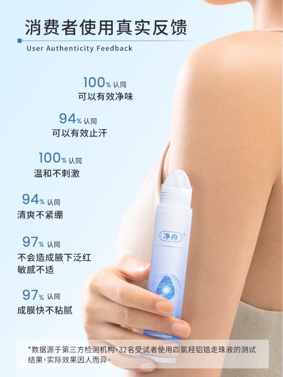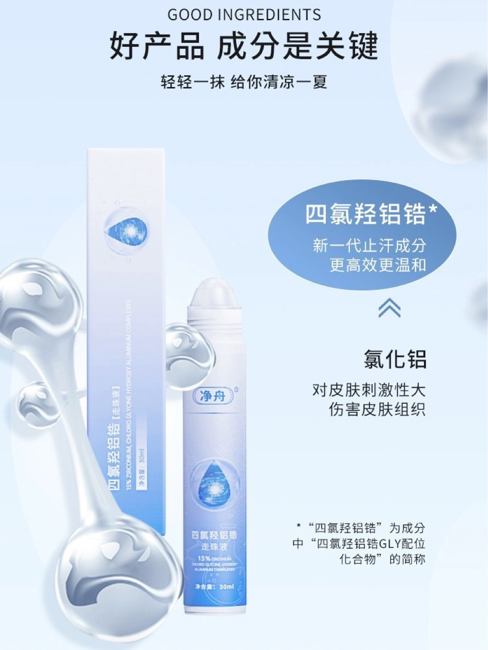 商品名称:净舟四氯羟铝锆爽身止汗滚走珠液下止汗持久干爽